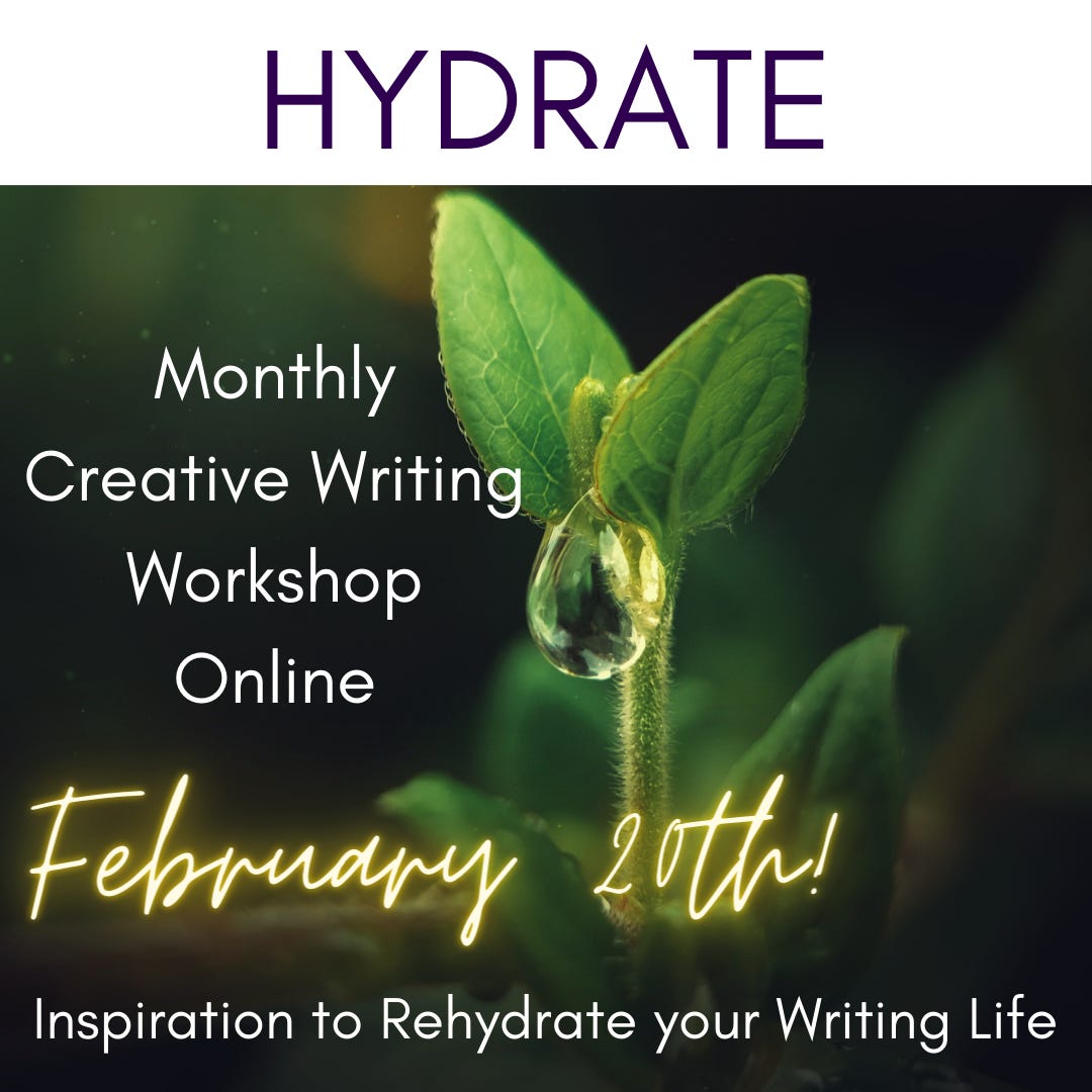 We all need regular hydration to plump up our words and imaginations which can become dried out for many reasons. Join us online for the next group creative writing workshop.